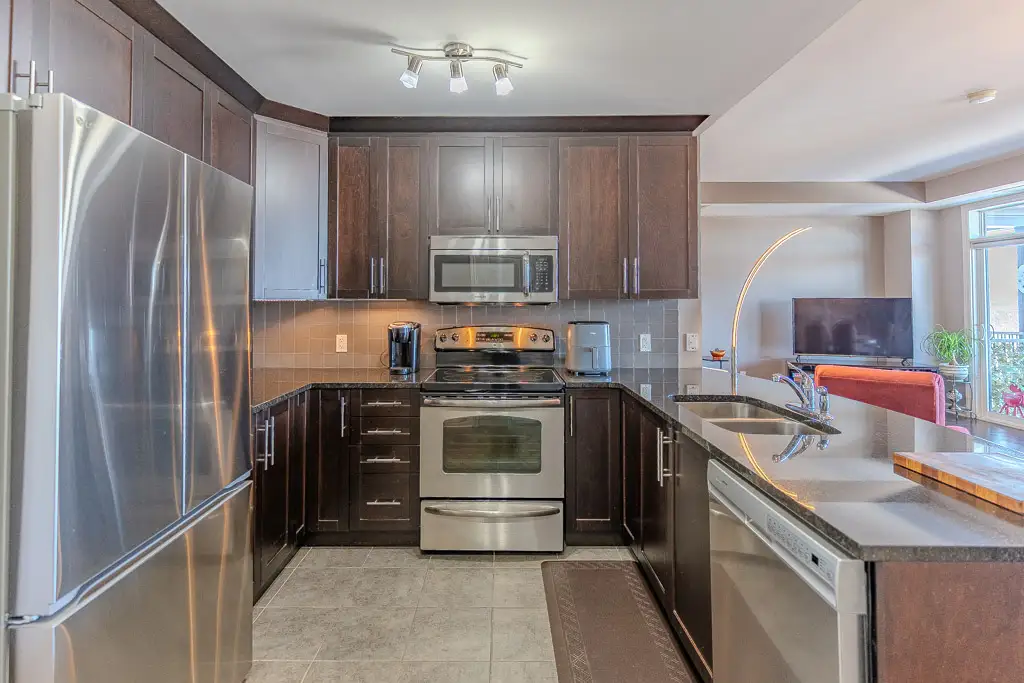 The modern kitchen blends elegance and practicality with granite countertops, stainless steel appliances, rich cabinetry, and generous workspace perfect for cooking and entertaining. In-unit laundry and dedicated storage ensure comfort and ease of living, while energy-efficient systems add value and convenience.