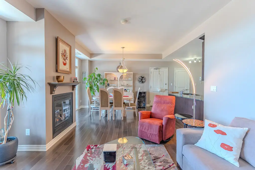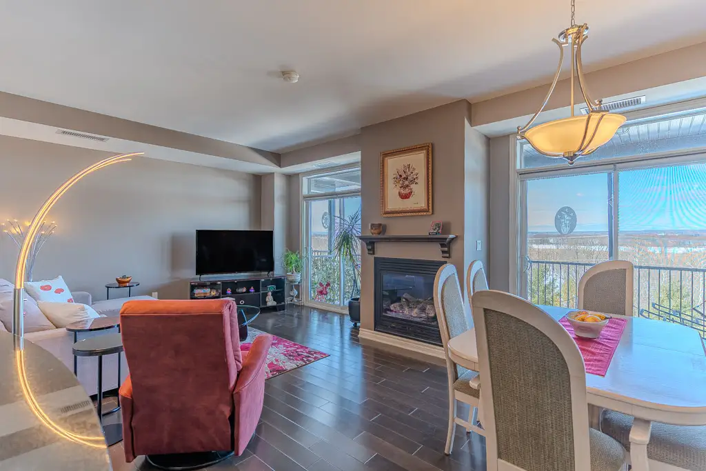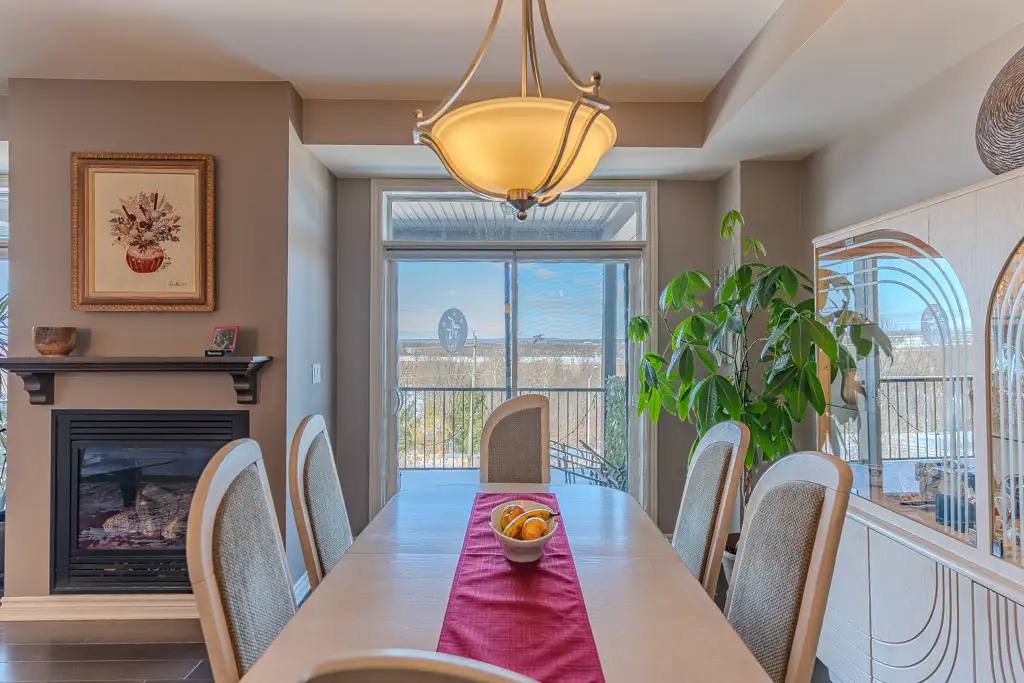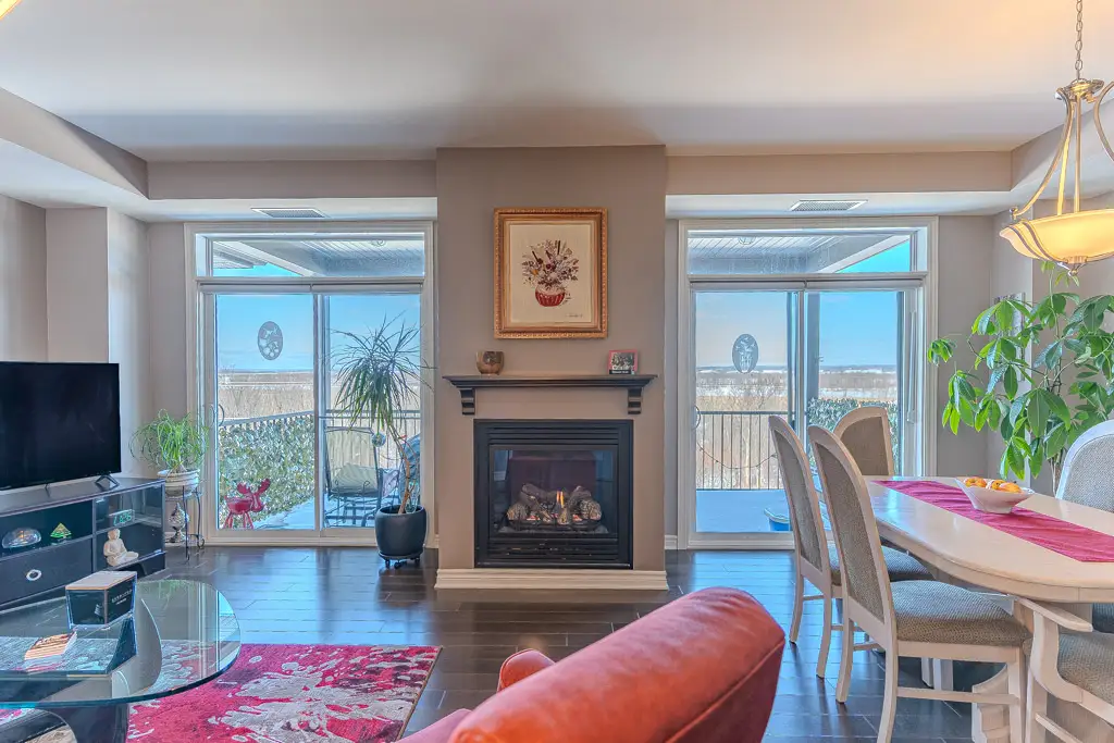 The open-concept living and dining area centers around a cozy gas fireplace and is filled with abundant natural light from dual sliding patio doors leading to a large private balcony. This space is ideal for entertaining or simply relaxing while enjoying the river views.