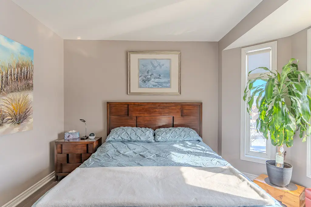 The foyer, with custom moldings, modern lighting and new flooring soars two storeys and is open to the kitchen above. A great space to greet guests. The main level living room and dining room have hardwood flooring, a gas fireplace flanked with custom shelving and french doors that overlook the private garden via a Juliette balcony. This wide open space is the perfect area for large family gatherings or quiet evenings reading while enjoying the warmth of the fireplace. The large kitchen with updated cabinetry, granite countertops, new stainless steel appliances including a gas stove, modern pearl tone backsplash and a large eating area is at the front of the main floor and has large windows bringing in loads of natural light. With ample counter space featuring a large island, a handy spot for a quick lunch or breakfast. The top floor, accessed via an open stairwell lit with a large skylight, features the spacious primary bedroom which includes a full en suite bathroom and large walk-in closet; two additional bedrooms all with gleaming hardwood floors and a full bathroom.