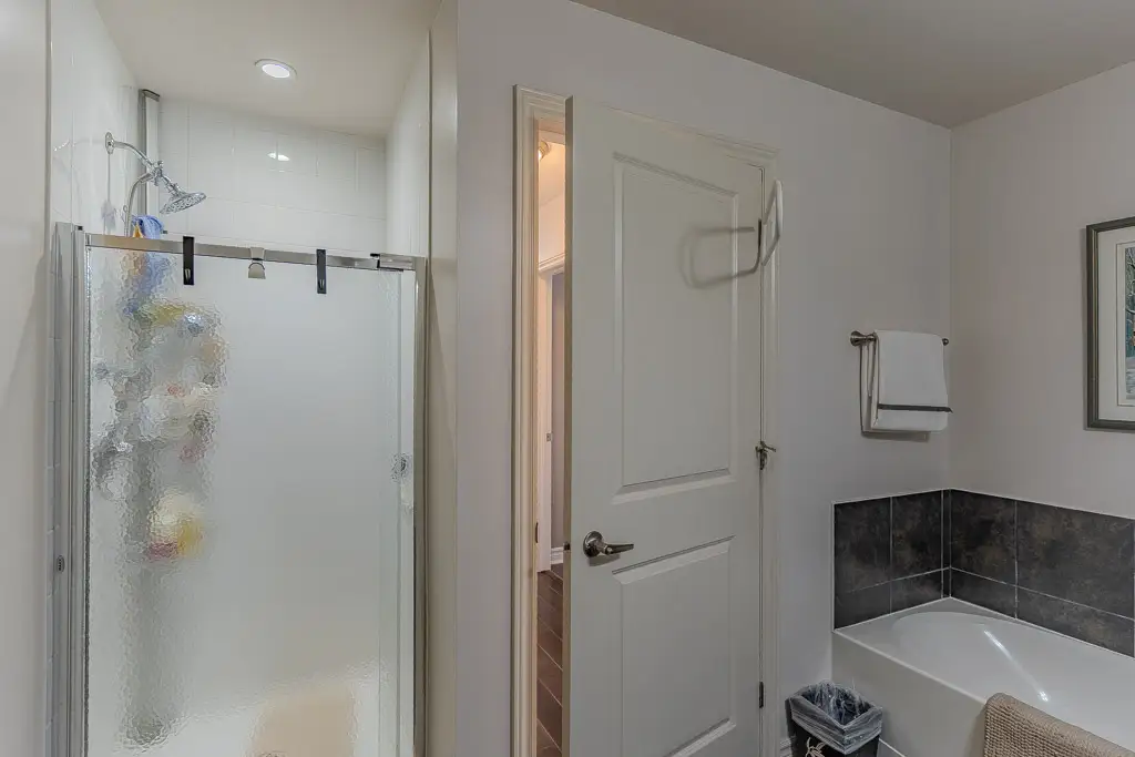 Inside, the suite is in immaculate condition, showcasing 9-foot ceilings, gleaming hardwood floors, and ceramic tile throughout. The inviting layout features two spacious bedrooms, including a primary suite with a generous walk-in closet and a luxurious full bathroom with a deep soaker tub and separate glass shower. A stylish powder room adds everyday functionality and convenience for guests.